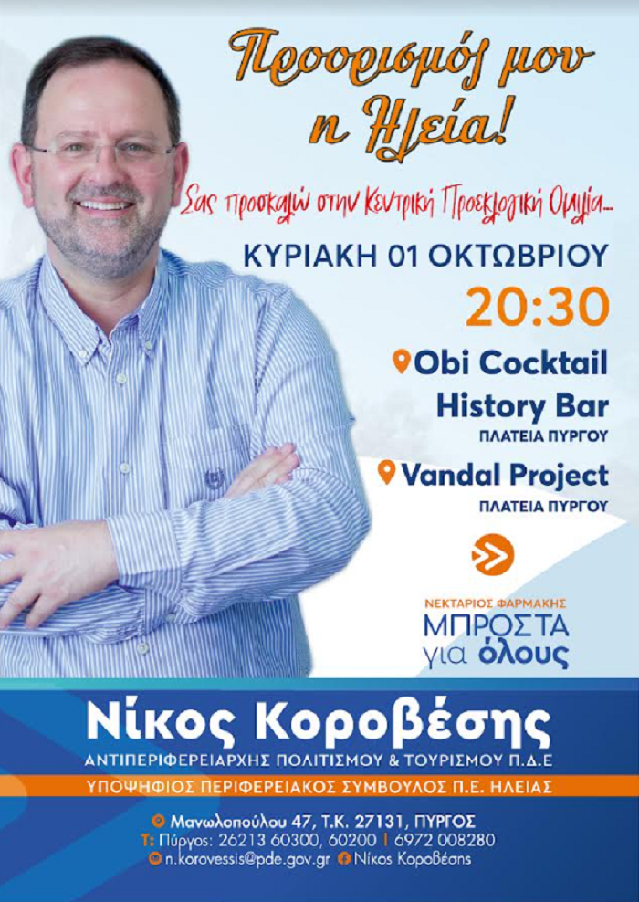 Την κεντρική προεκλογική του ομιλία πραγματοποιεί την Κυριακή 1η Οκτωβρίου, ο Αντιπεριφερειάρχης κι εκ νέου υποψήφιος Περιφερειακός Σύμβουλος Νίκος Κοροβέσης.