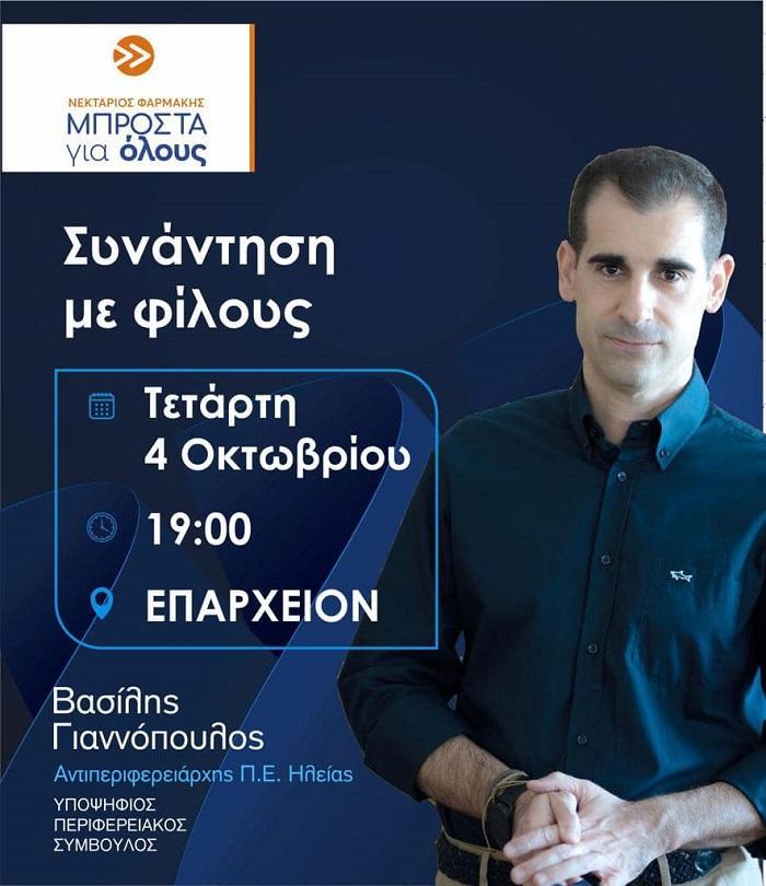 Στα πλαίσια αυτά εντάσσεται και η εκδήλωση που θα πραγματοποιήσει την Τετάρτη 4 Οκτωβρίου στο λόφο του Επαρχείου στον Πύργο, ο Αντιπεριφερειάρχης Ηλείας και νυν υποψήφιος Περιφερειακός Σύμβουλος Βασίλης Γιαννόπουλος, ο οποίος θα συναντηθεί με φίλους.