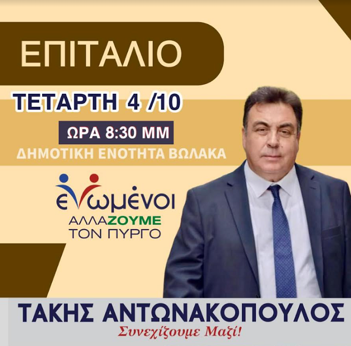 Συνεχίζοντας την προεκλογική κίνηση του καθώς και τις επισκέψεις του σε περιοχές του Πύργου και των δημοτικών κοινοτήτων, ο επικεφαλής του συνδυασμού «Ενωμένοι αλλάζουμε τον Πύργο» υποψήφιος Δήμαρχος Πύργου Τάκης Αντωνακόπουλος, θα εκφωνήσει πολιτική ομιλία στο Επιτάλιο την Τετάρτη 4 Οκτωβρίου και ώρα 20.30