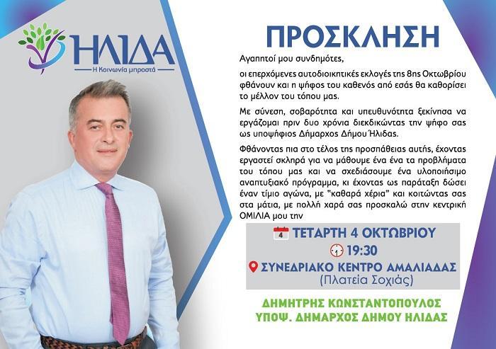 Αύριο Τετάρτη 4 Οκτωβρίου, θα πραγματοποιηθεί η κεντρική ομιλία του υποψηφίου Δημάρχου Ηλιδας Δημήτρη Κωνσταντόπουλου, στις 19.30, στο Συνεδριακό Κέντρο της Αμαλιάδας [πλατεία Σοχιάς].
