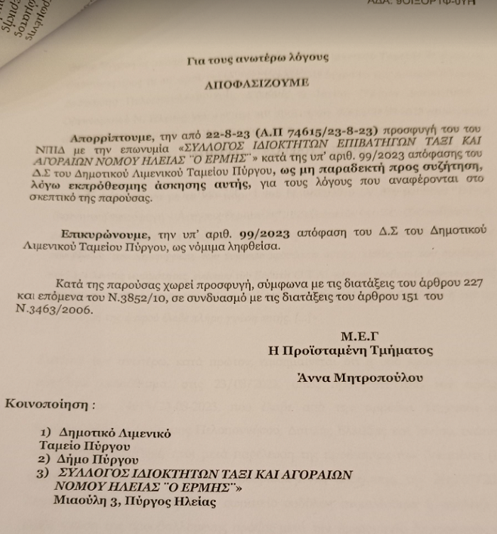 Η προσφυγή, τελικά απορρίφθηκε από την Αποκεντρωμένη. Συγκεκριμένα, όπως γνωστοποίησε η Αποκεντρωμένη Διοίκηση Πελ/νήσου, Δυτ. Ελλάδας και Ιονίου με την υπ’ αριθμ. Πρωτ. 89750/10-10-2023 απορρίφθηκε προσφυγή του Συλλόγου Ιδιοκτητών Επιβατικών Ταξί κατά απόφασης του Δ.Σ. του Δημοτικού Λιμενικού Ταμείου Κατακόλου, που αφορούσε θέμα παραχώρησης χρήσης κοινοχρήστου χώρου επί της χερσαίας ζώνης του λιμένα.