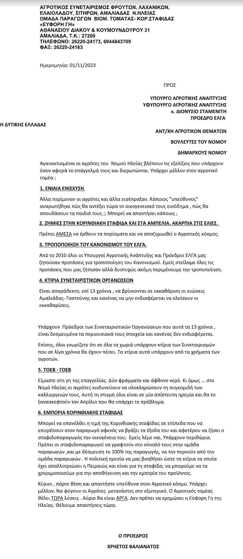 Σε μια απέλπιδα προσπάθεια να λυθούν επιτέλους ορισμένα από τα πολλά αγροτικά προβλήματα, η Ομάδα Παραγωγών Αμαλιάδας έστειλε και νέα επιστολή στον υπουγό και υφυπουργό Αγροτικής Ανάπτυξης καθώς και και στον Πρόεδρο του ΕΛΓΑ.