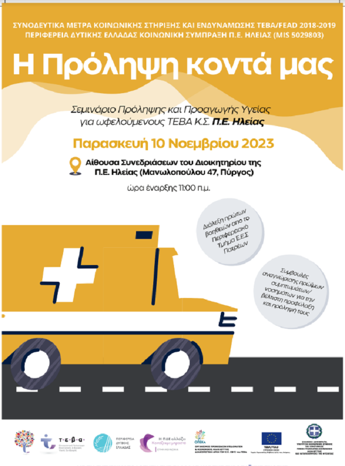 Σε συνέχεια της επιτυχημένης δράσης «Η Πρόληψη Κοντά μας» που αφορά προληπτικές εξετάσεις σε ωφελούμενους ΤΕΒΑ, η Περιφέρεια Δυτικής Ελλάδας διοργανώνει σεμινάριο Πρώτων Βοηθειών για τους ωφελούμενους ΤΕΒΑ της Κ.Σ. Περιφερειακής Ενότητας Ηλείας, την Παρασκευή 10 Νοεμβρίου 2023, με ώρα προσέλευσης στις 11:00 στην Αίθουσα Συνεδριάσεων του Διοικητηρίου της Π.Ε Ηλείας, Μανωλοπούλου 47.