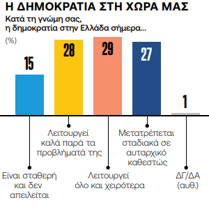 Διευρύνοντας την οπτική, διερευνήθηκε το βλέμμα των ερωτωμένων για τη σημερινή δημοκρατία και τη Μεταπολίτευση εν γένει. Αρχικά, αξιοποιήθηκε ένα ερώτημα που είχε τεθεί και στην πρωτοποριακή έρευνα του ΕΚΚΕ για την πολιτική κουλτούρα στις χώρες της Νότιας Ευρώπης («Επιθεώρηση Κοινωνικών Ερευνών», τχ. 69Α, 1988), κοντά τότε στα γεγονότα. Η απόσταση του χρόνου δεν φαίνεται να κλονίζει τη σαφήνεια της δημοκρατικής επιλογής: 81% θεωρούν τη δημοκρατία προτιμότερη από κάθε άλλο πολίτευμα (87% στην τότε έρευνα) – και μάλιστα περισσότερο εμπεδωμένη στους boomers, την καθαυτό «γενιά του Πολυτεχνείου» -, ενώ ένα 12% σχετικοποιεί αυτή την επιλογή θεωρώντας ότι σε ορισμένες συνθήκες μια δικτατορία μπορεί να είναι προτιμότερη (μόλις 5% στην τότε έρευνα) και μόνο ένα 6% απαντά ότι το πολίτευμα δεν έχει σημασία. Αν όμως επί της αρχής η πίστη στη δημοκρατία είναι ακλόνητη, η αποτίμηση της σημερινής δημοκρατίας στη χώρα είναι πιο ζοφερή: μόνο ένα 15% θεωρεί ότι είναι σταθερή και δεν απειλείται και ένα 28% ότι λειτουργεί καλά παρά τα προβλήματά της. Από εκεί και πέρα ένα 29% πιστεύει ότι λειτουργεί όλο και χειρότερα και ένα 27% ότι μετατρέπεται σταδιακά σε αυταρχικό καθεστώς.