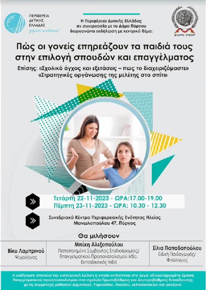 «Πως οι γονείς επηρεάζουν τα παιδιά τους στην επιλογή σπουδών και επαγγέλματος» είναι το κεντρικό θέμα της εκδήλωσης, που διοργανώνει η Περιφέρεια Δυτικής Ελλάδας, σε συνεργασία με τον Δήμο Πύργου, την Τετάρτη 22 και την Πέμπτη 23 Νοεμβρίου 2023, στο Συνεδριακό Κέντρο της Περιφερειακής Ενότητας Ηλείας.
