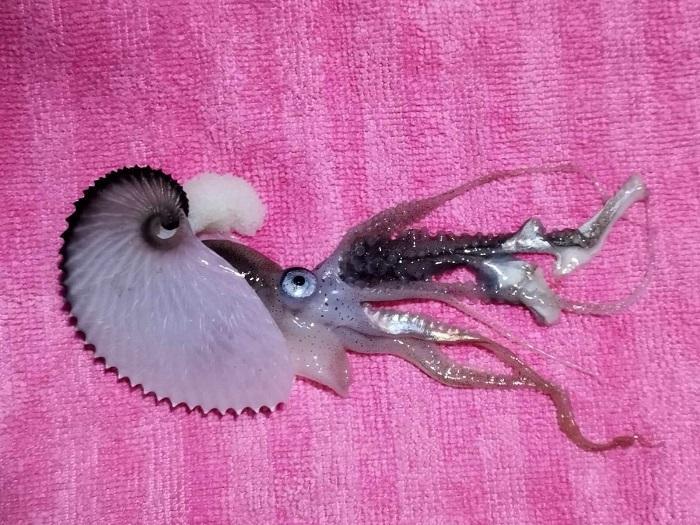 Μέσα στο παράξενοκέλυφος ζει το θηλυκό Αργοναύτης, προστατεύοντας τα αυγά από επίθεση αρπακτικώνμέχρι να εκκολαφθούν. Έχει οκτώ πλοκάμια, δύο από τα οποία είναι μοναδικά, πούτα χρησιμοποιεί για τη συλλογή τροφής. Τα κοχύλια από Αργοναύτες ξεβράζονται σεπαγκόσμιο επίπεδο, αλλά η συλλογή ενός ζώου που εξακολουθεί να κατοικεί στοκέλυφός του είναι ένα πολύ σπάνιο γεγονός.