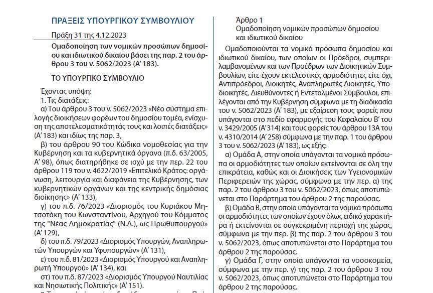 Σύμφωνα με το συγκεκριμένο ΦΕΚ που δημοσιεύθηκε με ημερομηνία 6 Δεκεμβρίου 2023, με πράξη του υπουργικού συμβουλίου, προχωράει η ομαδοποίηση νομικών προσώπων δημοσίου και ιδιωτικού δικαίου και μάλιστα σε τρεις τομείς. Ο πρώτος τομέας αναφέρεται στα νομικά πρόσωπα και τις αρμοδιότητες των οποίων εκτείνονται σε όλη την επικράτεια, καθώς και στις Διοικήσεις των Υγειονομικών Περιφερειών της χώρας.