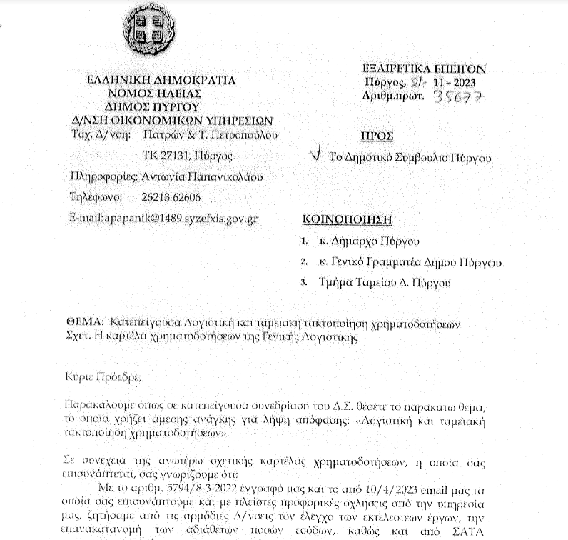 Συνεχίζουν να παραμένουν απλήρωτοι πολλοί επαγγελματίες του Πύργου που έχουν παράσχει έργα, υπηρεσίες, προμήθειες, εξαιτίας της στάσης μερίδας δημοτικών συμβούλων που «μπλοκάρουν» το θέμα στο Δημοτικό Συμβούλιο. Στερώντας έτσι από τους επαγγελματίες τα χρήματα τους, αλλά στερώντας και την αγορά της πόλης από τα χρήματα αυτά, και σε εορταστική περίοδο μάλιστα. Η αναπλ. Διευθύντρια Οικονομικών Υπηρεσιών του Δήμου Πύργου με το υπ’ αριθμ. Πρωτ. 35677/21-11/23 έγγραφο της προς το Δημοτικό Συμβούλιο, ζητά κατεπείγουσα Λογιστική και Ταμειακή τακτοποίηση χρηματοδοτήσεων.