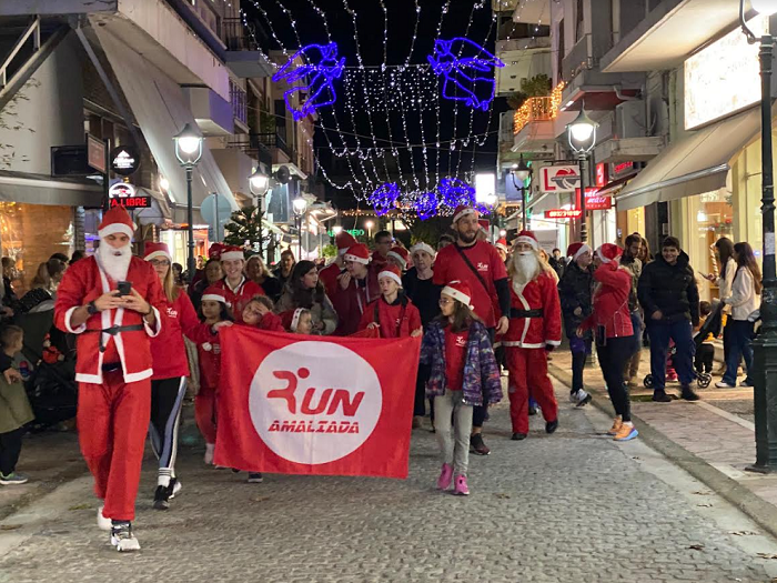 Για πρώτη φορά πραγματοποιήθηκε με επιτυχία το Amaliada Santa Run, με την συμμετοχή μικρών και μεγάλων, οι οποίοι έβαλαν τα σκουφάκια του Άγιου Βασίλη και με σύμμαχο την καλή τους διάθεση και τις κόρνες τους περπάτησαν από την πλατεία Ανεμομύλου και μέσω του πεζόδρομου κατέληξαν στην πλατεία Αγίου Αθανασίου, δίνοντας το σύνθημα για την έναρξη της γιορτής. Λίγο πριν ανάψει το δένδρο τις ευχές του έδωσε ο αναπληρωτής Δήμαρχος κ. Βασίλης Παπαδόπουλος ο οποίος μετέφερε και τα χρόνια πολλά και τις ευχές του Δημάρχου Ήλιδας κ. Γιάννη Λυμπέρη για καλά Χριστούγεννα και καλή χρονιά και κάλεσε τους πολίτες να απολαύσουν τις εκδηλώσεις. Στην συνέχεια τις ευχές τους έδωσαν ο πρόεδρος της Δημοτικής Κοινότητας Αμαλιάδας κ. Δημήτρης Αδαμόπουλος, ο πρόεδρος του Εμπορικού Συλλόγου Ήλιδας κ. Φώτης Νικολόπουλος- ο Σύλλογος είναι συνδιοργανωτής στις εκδηλώσεις- και ο νεοεκλεγείς Δήμαρχος Ήλιδας κ. Χρήστος Χριστοδουλόπουλος, ο οποίος ευχήθηκε αυτές τις γιορτές να μην είναι κανείς μόνος.