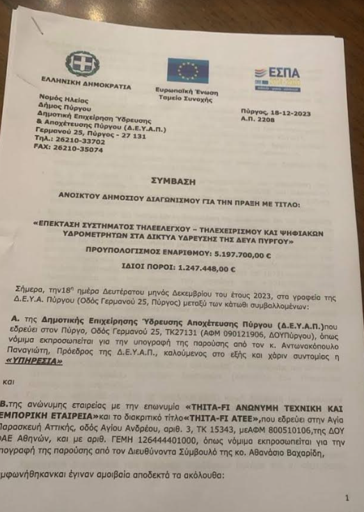 Υπεγράφη τη Δευτέρα (18/12) η σύμβαση με τον ανάδοχο για το μεγάλο έργο «Επέκταση συστήματος τηλεελέγχου – τηλεχειρισμού και Ψηφιακών υδρομετρητών στα δίκτυα ύδρευσης της ΔΕΥΑΠ». Προηγήθηκε Ανοιχτός Διεθνής ηλεκτρονικός Διαγωνισμός και η διαδικασία ολοκληρώθηκε με την ανάδειξη του αναδόχου (που είναι η THITA – FI ΑΤΕΕ).