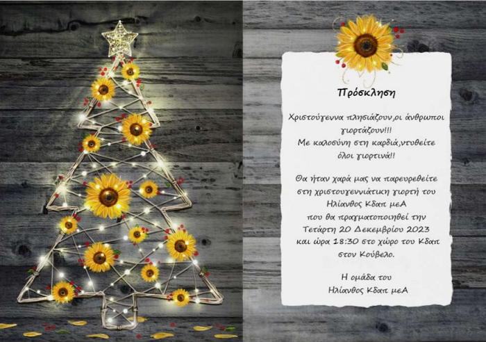 Χριστούγεννα πλησιάζουν, οι άνθρωποι γιορτάζουν!!! Με καλοσύνη στην καρδιά, ντυθείτε όλοι γιορτινά!!! Θα ήταν χαρά μας να παρευρεθείτε στην Χριστουγεννιάτικη γιορτή του ΗΛΙΑΝΘΟΣ ΚΔΑΠ μεΑ που θα πραγματοποιηθεί την Τετάρτη 20 Δεκεμβρίου 2023 και ώρα 18:30 στον χώρο του ΚΔΑΠ στον Κούβελο.