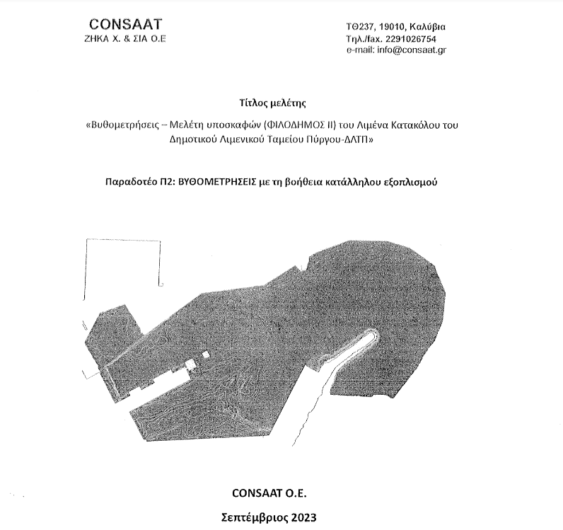 Παραδόθηκε η μελέτη με αντικείμενο “Βυθομετρήσεις – Μελέτη υποσκαφών του Λιμένα Κατακόλου”