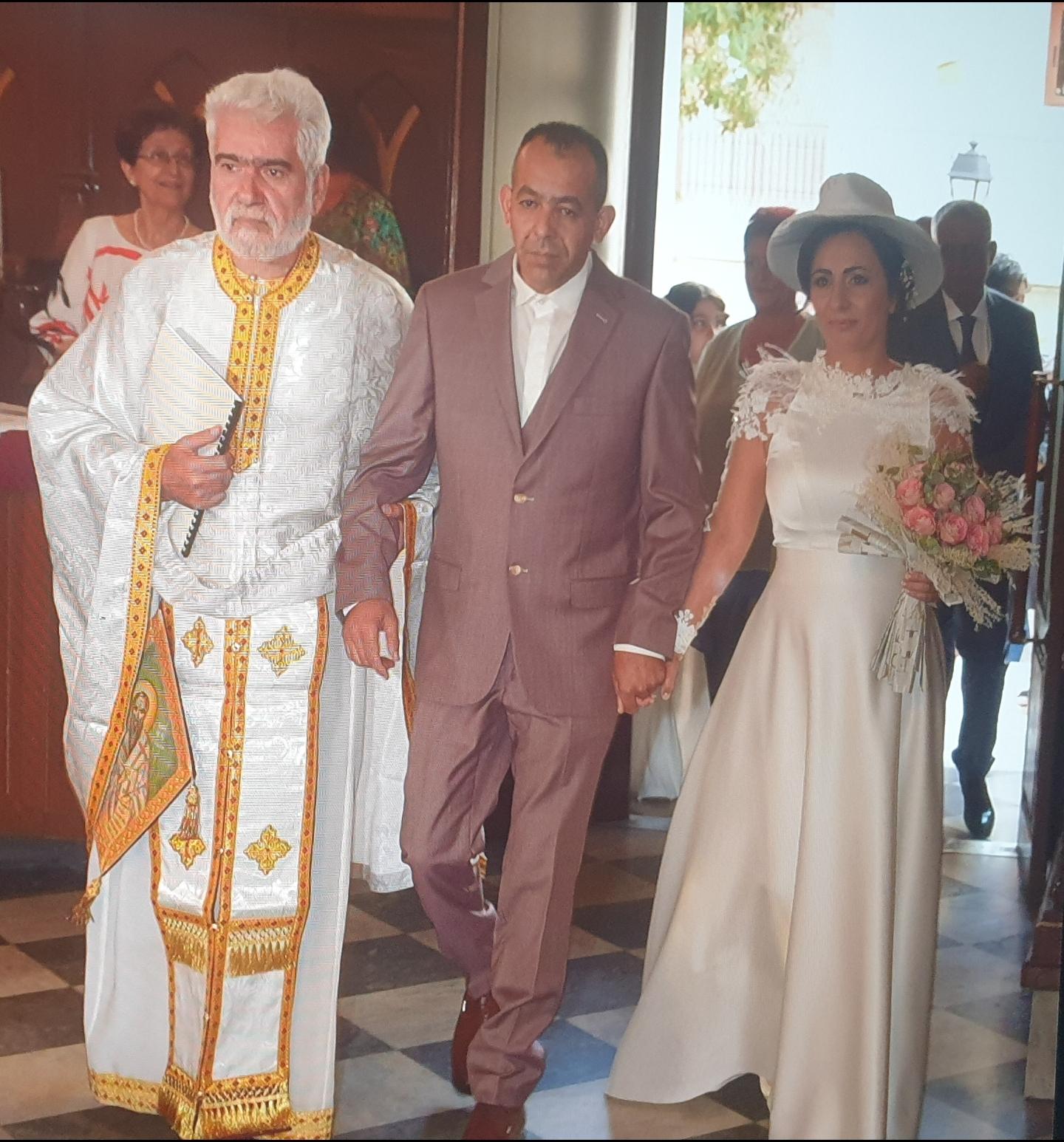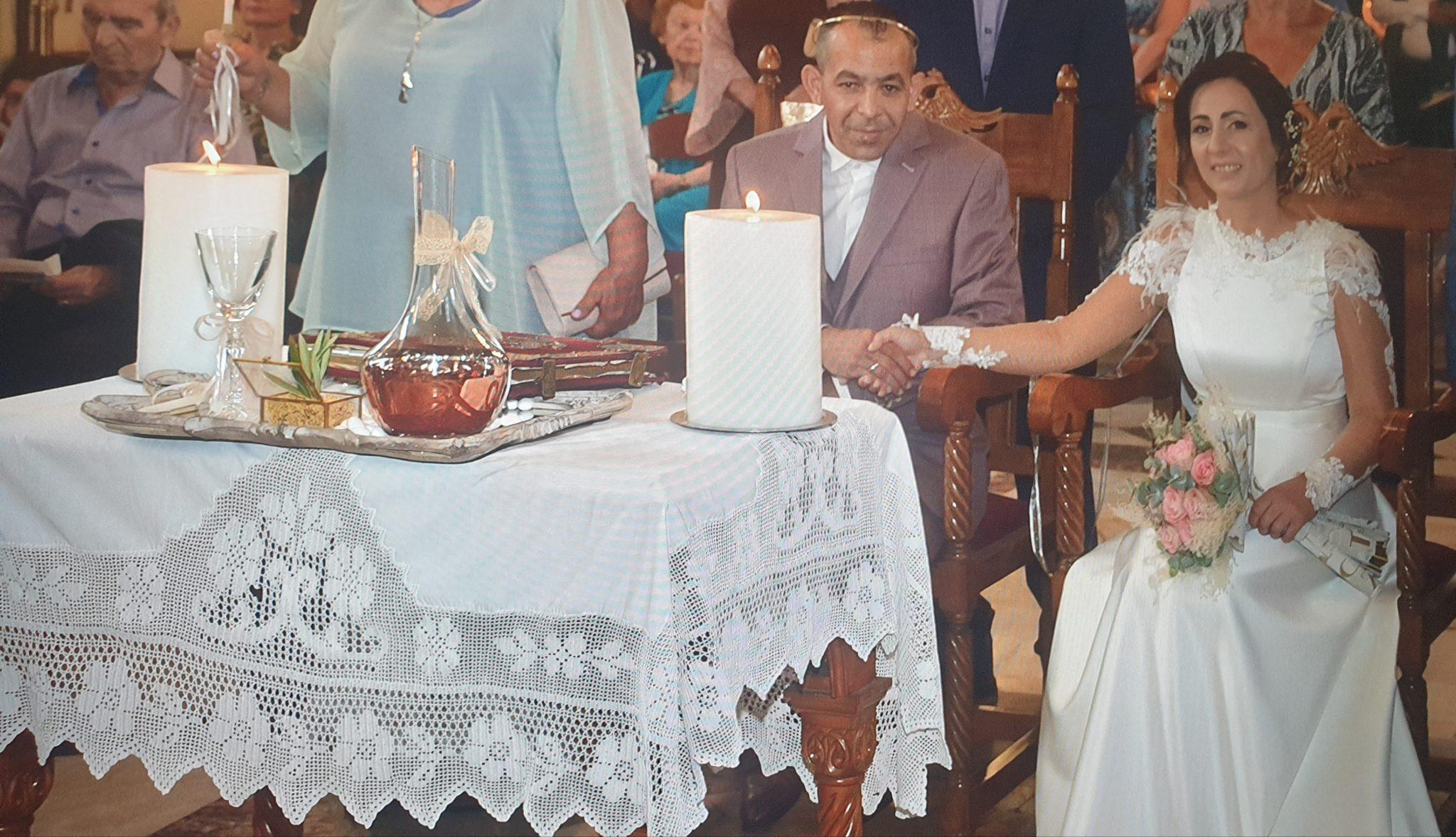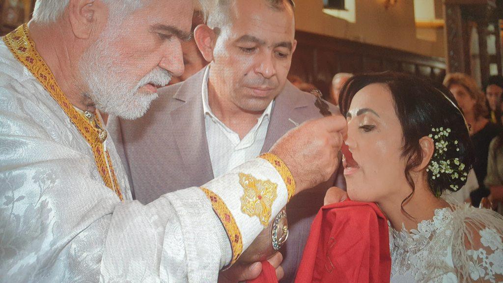 Τους νεόνυμφους παρέλαβε από την είσοδο της εκκλησίας ο εφημέριος, π. Βασίλειος Λαγκαδινός, οδηγώντας τους, ο ίδιος στο εσωτερικό του Ιερού Ναού ενώ κατά την διάρκεια της Θείας Λειτουργίας ακούγονταν οι ψαλμοί του γάμου και το ζευγάρι είχε την δυνατότητα να κάθεται. Ένα άλλο ιδιαίτερο χαρακτηριστικό του βυζαντινού γάμου είναι ότι το ζευγάρι που παντρεύτηκε είναι αυτό που έλαβε πρώτο τη Θεία Κοινωνία και στο τέλος αφού ολοκληρώθηκε η Λειτουργία και κοινώνησαν και οι πιστοί που βρίσκονταν στην εκκλησία, ακολούθησε ο χορός του Ησαΐα. Κουμπάροι του ζευγαριού, ήταν οι Ντίνα Γαβριλοπούλου και Παντελής Θεοδωρόπουλος για τους οποίους η τέλεση του Βυζαντινού Γάμου, υπήρξε μια πρωτόγνωρη διαδικασία.