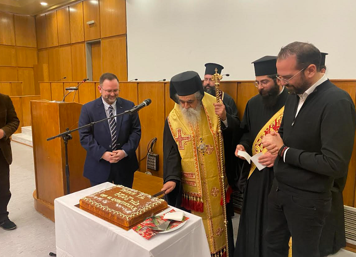 Παρουσία του Περιφερειάρχη Δυτικής Ελλάδας, Νεκτάριου Φαρμάκη, Αντιπεριφερειαρχών και Περιφερειακών Συμβούλων, Δημάρχων, Αντιδημάρχων και Δημοτικών Συμβούλων, εκπροσώπων βουλευτών, της ηγεσίας των Σωμάτων Ασφαλείας του Νομού, φορέων και πλήθους πολιτών, ο Σεβασμιώτατος Μητροπολίτης Ηλείας, κ.κ. Αθανάσιος ευλόγησε την βασιλόπιτα και στον σύντομο χαιρετισμό ευχήθηκε «να είναι πλούσια τα υλικά αγαθά της Π.Ε. Ηλείας γιατί πάντοτε η Εκκλησία ευλογεί τα αγαθά για να μπορεί ο άνθρωπος να ζήσει ελεύθερος και άνετα αφού δεν είναι μόνο σώμα και ψυχή αλλά μια ψυχοσωματική οντότητα. Και έχει ανάγκη και τα δύο» και πρόσθεσε πως «Ο Χριστός πρώτα δίδαξε, πρώτα νουθέτησε, πρώτα κατεύθυνε τον κόσμο σε λόγο σωστό με το κήρυγμα και τα θαύματά του και μετά ευλόγησε την ύλη για να τραφεί».