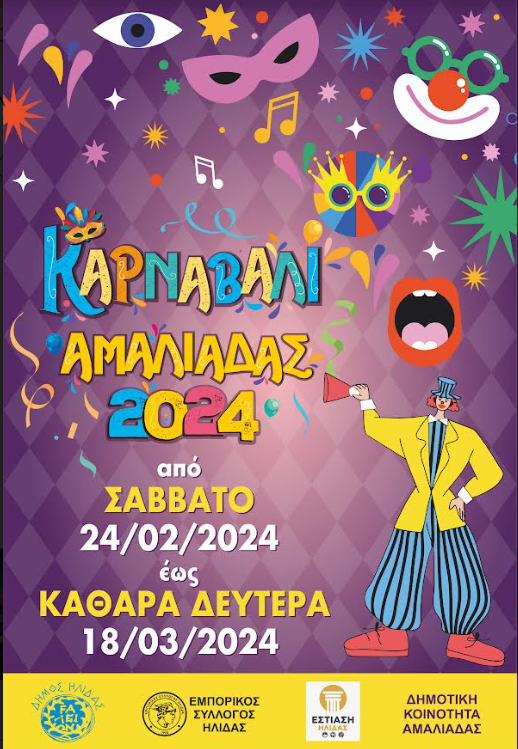 Η φετινές αποκριές της Αμαλιάδας θα κορυφωθούν με τη μεγάλη Καρναβαλική παρέλαση, η οποία έχει προγραμματιστεί για την Κυριακή 10 Μαρτίου 2024 και ώρα 3 το μεσημέρι, όπου καρναβαλιστές και άρματα θα παρελάσουν στις οδούς Αρχαίας Ήλιδας και Ερμού. Την παρουσίαση της παρέλασης αναλαμβάνει για φέτος ο γνωστός performer και παρουσιαστής Τρύφωνας Σαμαράς, ο οποίος με το δικό του κέφι και μπρίο αναμένεται να ξεσηκώσει τους καρναβαλιστές και το κοινό. Το υπόλοιπο πρόγραμμα και οι πολλές καρναβαλικές εκδηλώσεις για παιδιά και μεγάλους, όπως και τα Κούλουμα της Καθαράς Δευτέρας στην Κουρούτα, αναμένεται να ανακοινωθούν από την Οργανωτική Επιτροπή μέσα στις επόμενες ημέρες.