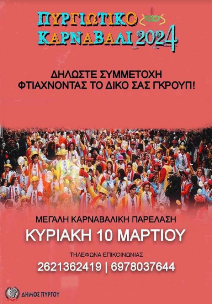 Θα θέλαμε να έχετε δηλώσει το γκρουπ σας έως τις 3 Μαρτίου 2024 ώστε να γίνουν πιο γρήγορα οι απαραίτητες ενέργειες για την οργάνωση της παρέλασης!! Η καρναβαλική γιορτή της 10ης Μαρτίου θα τελειώσει με μεγάλη συναυλία στην κεντρική πλατεία μας και ευελπιστούμε ο Πύργος μας να γεμίσει με κόσμο, χαρά και ελπίδα για το μέλλον!!