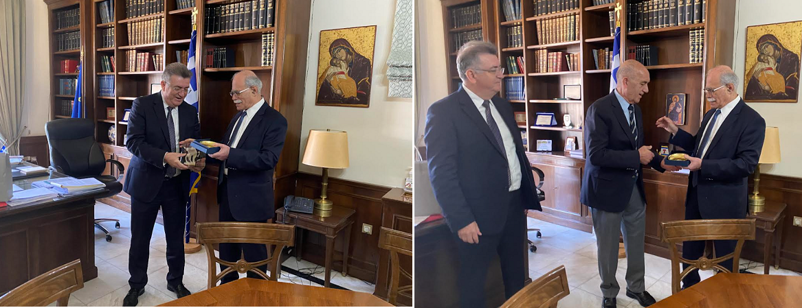 Στο τέλος της συνάντησης οι Δήμαρχοι, Στάθης Καννής και Νίκος Σταυρέλης, αντήλλαξαν ως αναμνηστικά δώρα τα εμβλήματα των δύο Δήμων, Πύργου και Κορίνθου. Ο Δήμαρχος Πύργου έδωσε αναμνηστικό και στον Πρόεδρο της Ε.Α.Α.Ν., Αντιναύαρχο ε.α. κ. Θεόδωρο Γερούκη για την επίσκεψή του στο Δημαρχείο και την πρωτεύουσα του Νομού με αφορμή τις εκδηλώσεις για τον Ιατρίδη. Τον Δήμαρχο Κορινθίων κ Σταυρέλη συνόδευαν οι κυρίες Έλενα Βλάχου-Πιπίνη άμισθη ειδική σύμβουλος Πολιτισμού και Τουρισμού, Παναγιώτα Μπάνου Πρόεδρος του Πολιτιστικού Συλλόγου Σολυγείας και Πετρούλα Στέφα Αντιπρόεδρος Πολιτιστικού Συλλόγου Σολυγείας και Γραμματέας του Δημάρχου Κορινθίων.