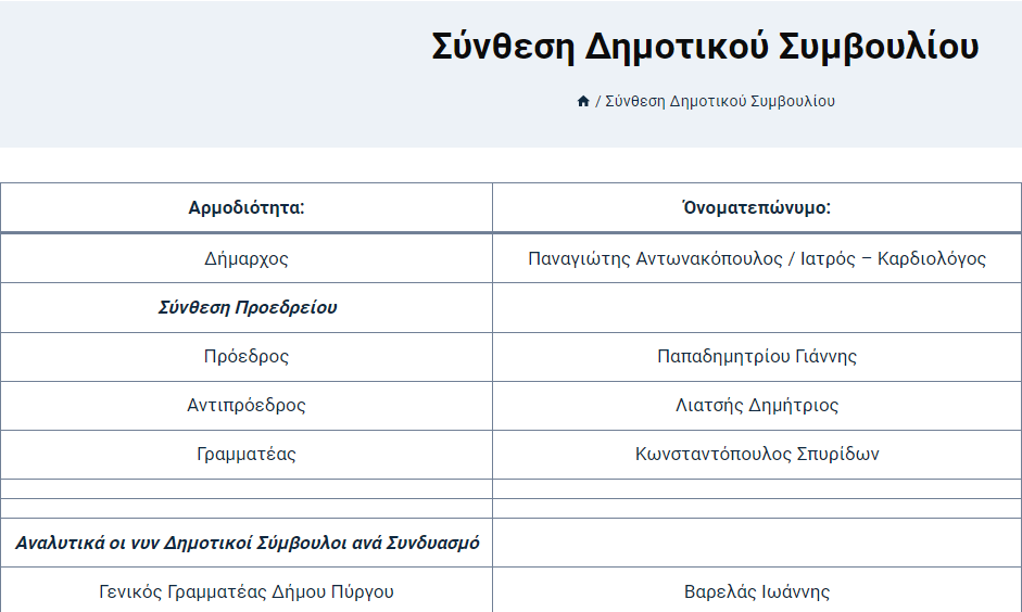 Ανημέρωτο το επίσημο site του δήμου Πύργου που εμφανίζει στη σύνθεση του Δημοτικού Συμβουλίου Δήμαρχο τον… Παναγιώτη Αντωνακόπουλο και μέλη της περασμένης θητείας, αλλά αντιδημάρχους εμφανίζει αυτούς που έχει σήμερα τοποθετήσει ο Στάθης Καννής.