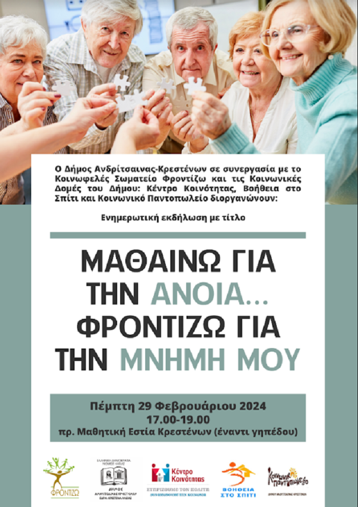 Ενημερωτική εκδήλωση με τίτλο: «Μαθαίνω για την Άνοια…Φροντίζω για την Μνήμη μου», διοργανώνει ο Δήμος Ανδρίτσαινας Κρεστένων σε συνεργασία με το Κοινωφελές Σωματείο «Φροντίζω» και τις Κοινωνικές Δομές του Δήμου: Κέντρο Κοινότητας, Βοήθεια στο Σπίτι και Κοινωνικό Παντοπωλείο, την Πέμπτη 29 Φεβρουαρίου και ώρα 17.00 στο χώρο εκδηλώσεων της πρ. Μαθητικής Εστίας Κρεστένων.