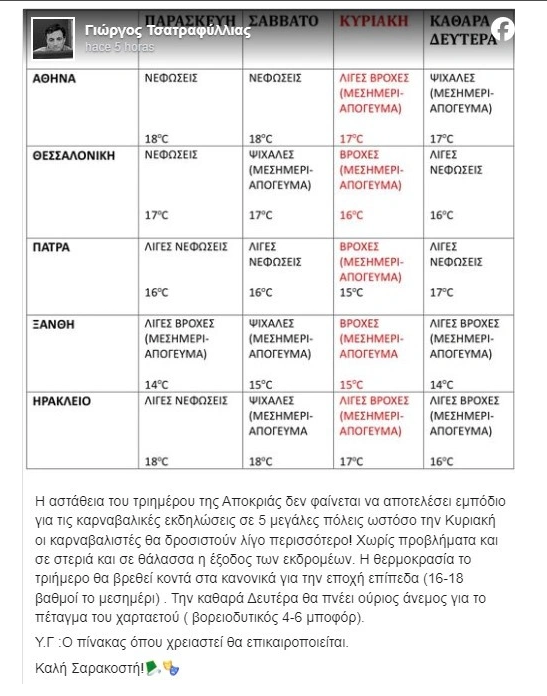 «Η αστάθεια του τριημέρου της Αποκριάς δεν φαίνεται να αποτελέσει εμπόδιο για τις καρναβαλικές εκδηλώσεις σε 5 μεγάλες πόλεις, ωστόσο την Κυριακή οι καρναβαλιστές θα δροσιστούν λίγο περισσότερο! Χωρίς προβλήματα και σε στεριά και σε θάλασσα η έξοδος των εκδρομέων.