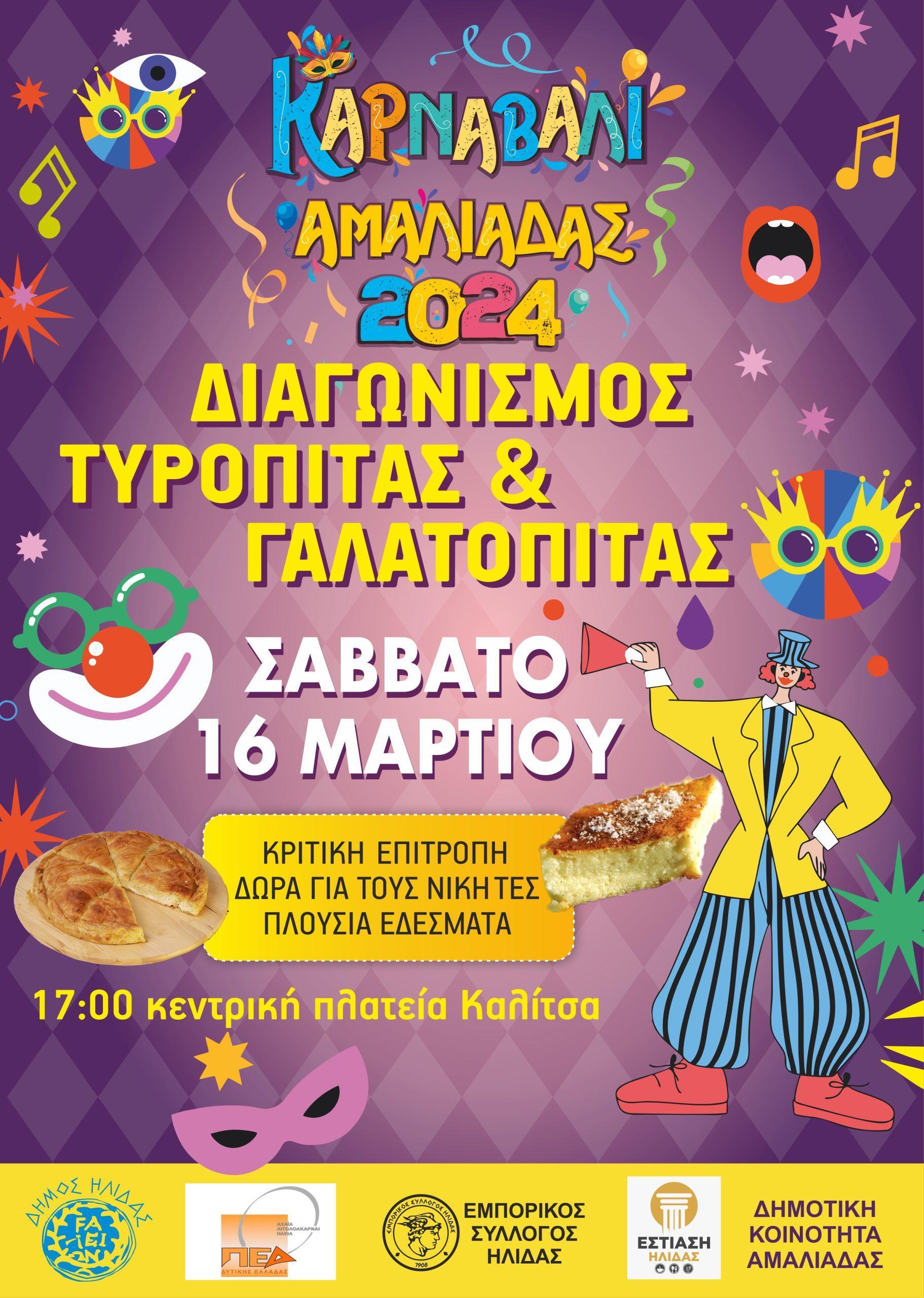 Γαλατόπιτες και τυρόπιτες σε πολλές εκδοχές και αποκριάτικες παραλλαγές, θα κάνουν την εμφάνισή τους στην ειδική σκηνή και ΚΑΡΝΑΒΑΛΟΓΕΥΣΙΓΝΩΣΤΕΣ θα δώσουν το δικό τους βαθμό, αναδεικνύοντας τις δύο καλύτερες σε κάθε κατηγορία. Εννοείται ότι τα κεράσματα θα είναι και για όλους τους παρευρισκόμενους, μετατρέποντας την πλατεία σε ένα μεγάλο αποκριάτικο τραπέζι! Το ραντεβού για το «ΔΙΑΓΩΝΙΣΜΟ ΤΥΡΟΠΙΤΑ – ΓΑΛΑΤΟΠΙΤΑ και ΟΛΩΝ των ΠΑΡΑΛΛΑΓΩΝ τους» έχει οριστεί για το Σάββατο 16 Μαρτίου 2024 από ώρα 17:00 το απόγευμα.