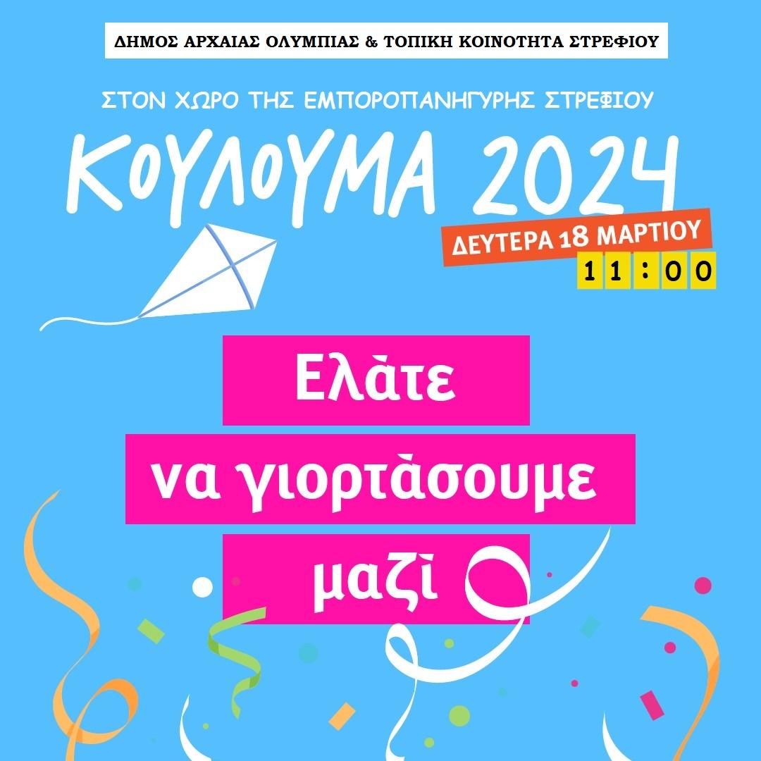 Όπως κάθε χρόνο, έτσι και φέτος, ο Δήμος Αρχαίας Ολυμπίας και η Τοπική Κοινότητα Στρεφίου θα γιορτάσουν τα Κούλουμα στο Στρέφι. Όσοι παρευρεθούν στην μεγάλη γιορτή, την Καθαρά Δευτέρα, θα μπορούν να απολαύσουν όλα τα Σαρακοστιανά εδέσματα δωρεάν και να διασκεδάσουν με μουσική και χορό. Ο χώρος της εμποροπανήγυρης Στρεφίου είναι το ιδανικό μέρος και για το πέταγμα του χαρταετού που οι μικροί μας φίλοι περιμένουν με ανυπομονησία!