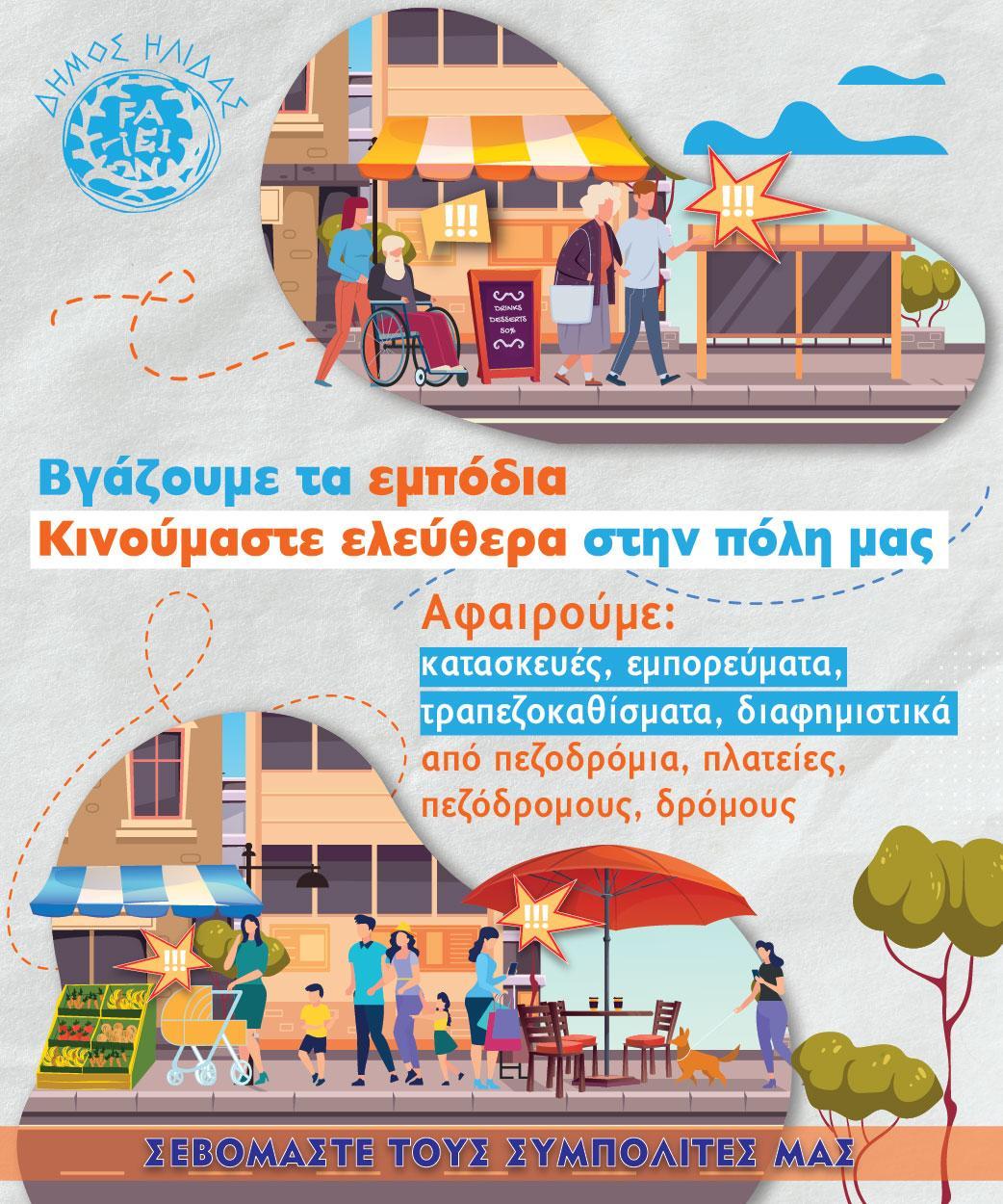 Σε εκστρατεία «σεβασμού του Δήμου και των δημοτών», όπως χαρακτηριστικά ονομάζει τη νέα του ενημερωτική καμπάνια προχωράει το επόμενο διάστημα ο Δήμος Ήλιδας, βασιζόμενος σε μία σειρά από ζητήματα που αφορούν στη βελτίωση της καθημερινότητας. Η πρώτη εκστρατεία αφορά στη βιώσιμη κινητικότητα εντός της πόλης της Αμαλιάδας, όπου στο πλαίσιο αυτό τονίζεται πως πρέπει να αφαιρεθούν από τους ιδιώτες και τους επαγγελματίες, τα εμπόδια ή οι παράνομες κατασκευές που οι ίδιοι έχουν τοποθετήσει σε πεζοδρόμια, πλατείες, πεζόδρομους και δρόμους.