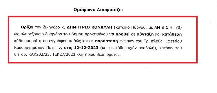 Σήμερα, Τρίτη, 2 Απριλίου και ώρα 13.00 θα προτείνετε την αντικατάσταση του δικηγόρου Δημητρίου Κονδύλη, που επί σειρά ετών χειρίζεται εκ μέρους του Δήμου Πύργου τις υποθέσεις: αγορά και λειτουργία του δεματοποιητή απορριμμάτων στο «ΠΟΤΟΚΙ» μεταφορά χιλιάδων τόνων απορριμμάτων το έτος 2009, αντιπλημμυρικά έργα το έτος 2012.