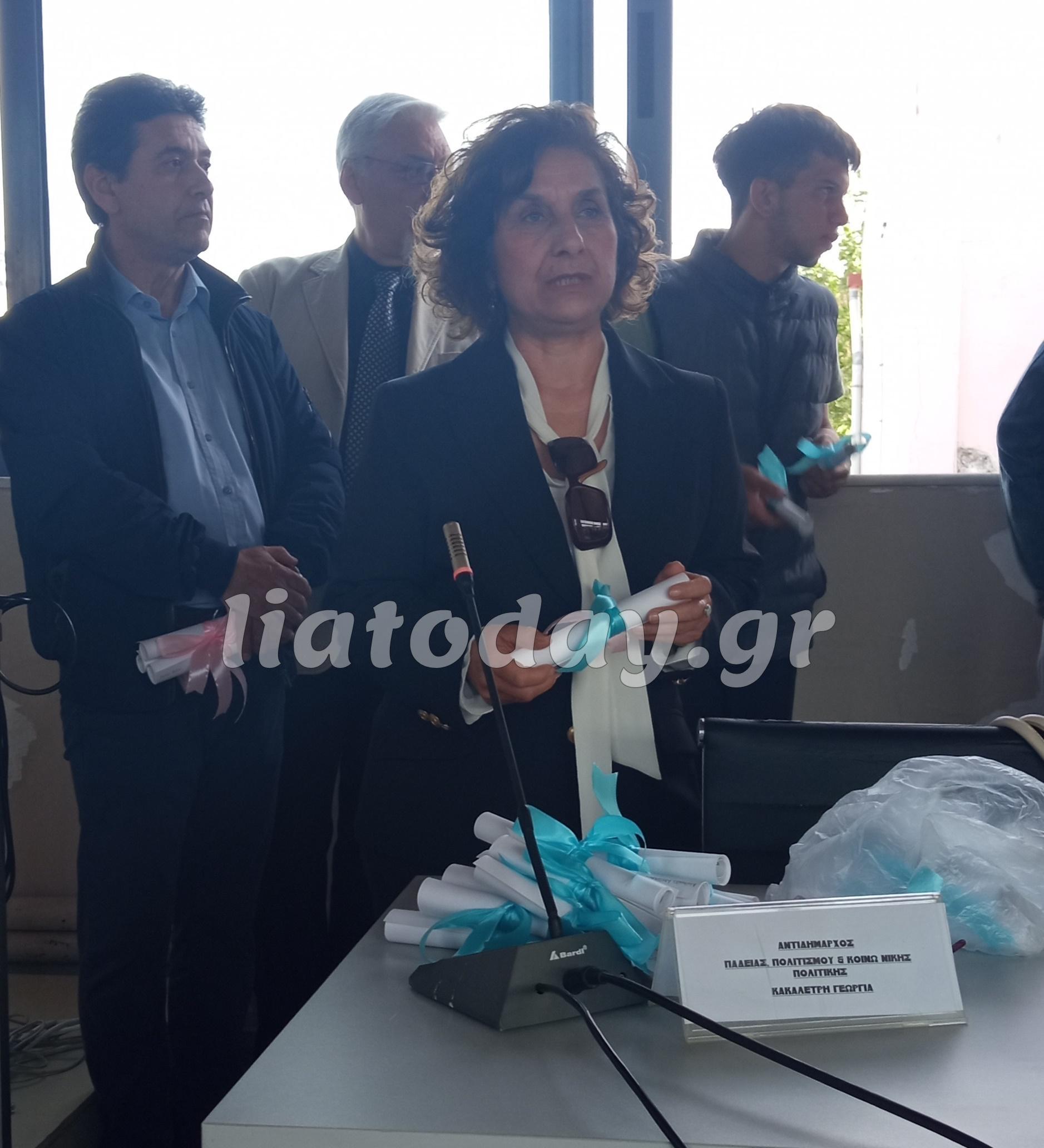Παίρνοντας τον λόγο αμέσως μετά η αντιδήμαρχος Παιδείας Γεωργία Κακαλέτρη, τόνισε πως “είναι συγκινητικό που σήμερα αυτή η αίθουσα γέμισε από παιδιά και γονείς. Συγχαρητήρια στα παιδιά για όσα κατάφεραν, στους γονείς τους αλλά και στους καθηγητές τους”.