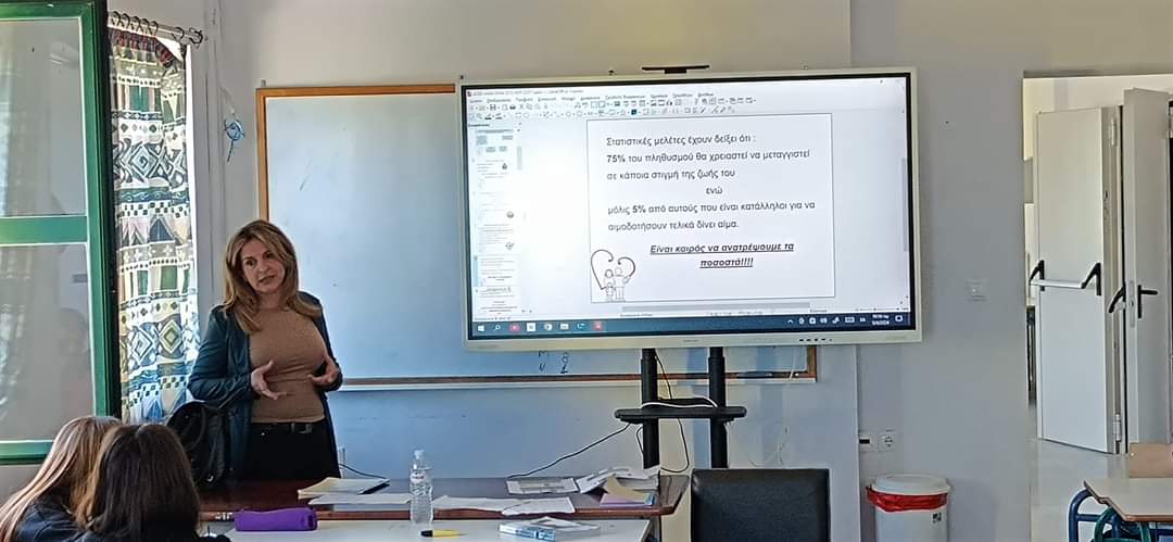 Στο πλαίσιο του προγράμματος Αγωγής Υγείας και γνωρίζοντας τις σημαντικές δυνατότητες του σχολείου στη διάδοση της εθελοντικής αιμοδοσίας, στην καλλιέργεια της αιμοδοσιακής συνείδησης των εφήβων, η Διευθύντρια Αιμοδοσίας Σταυροπούλου Γιαννούλα, ενημέρωσε τους νέους στα σχολεία, τους αυριανούς εθελοντές αιμοδότες σε θέματα που αφορούν στην εθελοντική προσφορά αίματος με σκοπό την ευαισθητοποίηση τους. Ακολούθησε συζήτηση μέσα από την οποία οι έφηβοι είχαν την ευκαιρία να εκφράσουν τους προβληματισμούς τους και να πάρουν απαντήσεις στις απορίες τους.