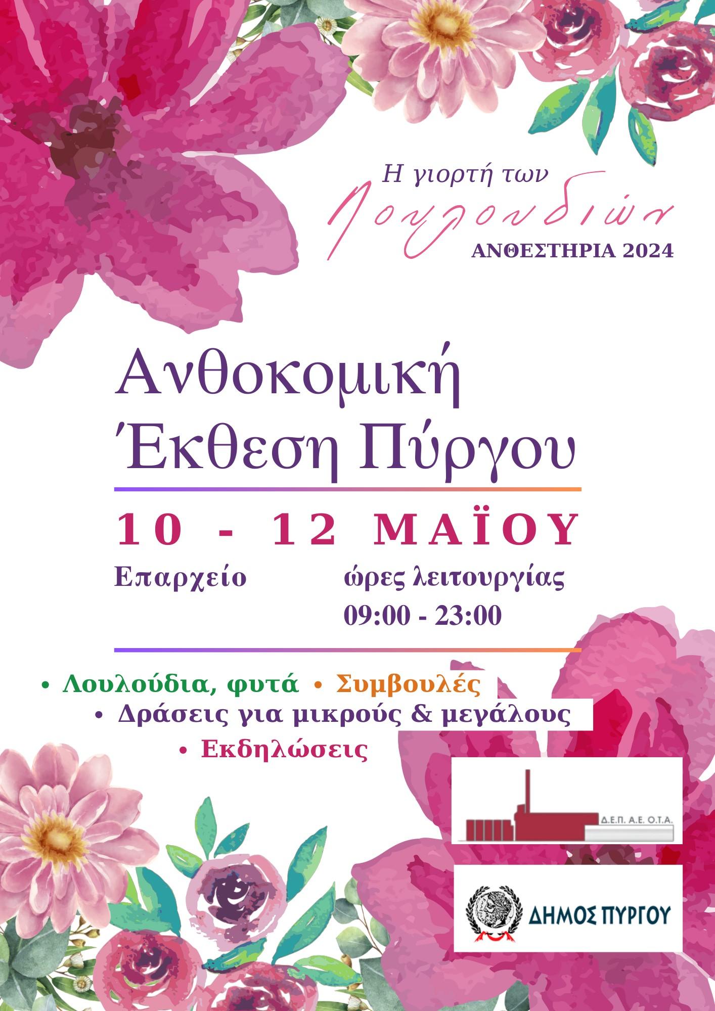 Και φέτος ο Πύργος γιορτάζει την Άνοιξη με την Ανθοκομική Έκθεση που θα διεξαχθεί στο Επαρχείο από τις 10 έως τις 12 Μαΐου. Οι επισκέπτες θα έχουν την δυνατότητα όχι μόνο να θαυμάσουν τα πολύχρωμα λουλούδια αλλά θα μπορούν να κάνουν και τις αγορές τους, να φωτογραφηθούν σε όμορφα διακοσμημένα σημεία, να απολαύσουν την βόλτα τους υπό τον ήχο ευχάριστων μουσικών ακουσμάτων, να παρακολουθήσουν καλλιτεχνικές εκδηλώσεις αλλά και να συμμετάσχουν σε δράσεις για μικρούς και μεγάλους.