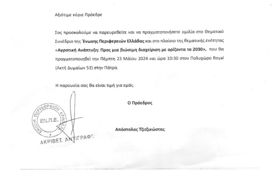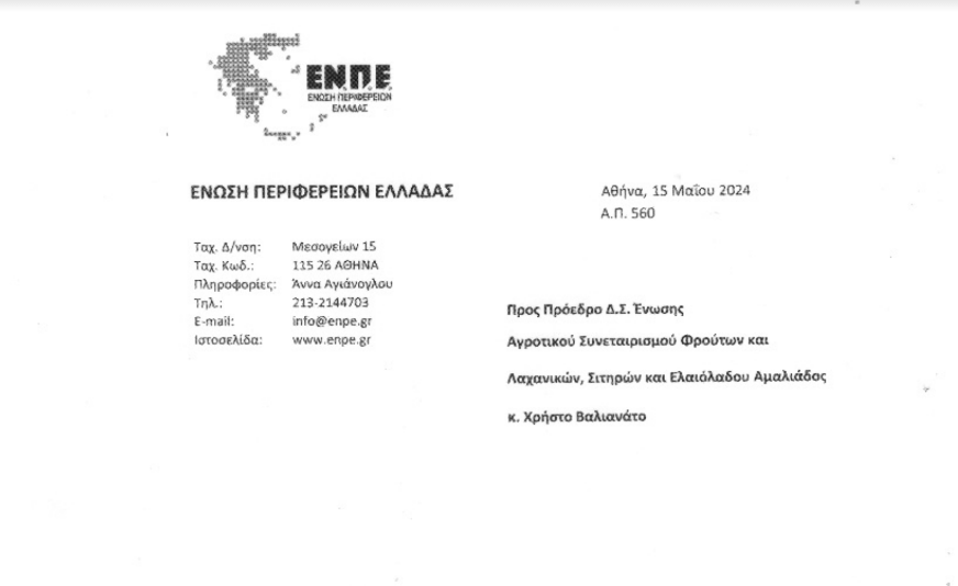 Πρόσκληση προκειμένου να συμμετέχει αλλά και να μιλήσει σε εκδήλωση της Ενωσης Περιφερειών Ελλάδας, με θέμα “Αγροτική Ανάπτυξη: Προς μια βιώσιμη διαχείρηση με ορίζοντα το 2030, έλαβε ο Πρόεδρος της Ομάδας Παραγωγών Αμαλιάδας, Χρήστος Βαλιανάτος.