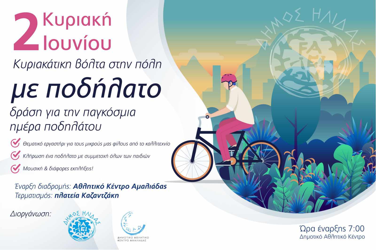 Μια Κυριακάτικη ποδηλατάδα στους κεντρικούς δρόμους της Αμαλιάδας διοργανώνει ο Δήμος Ήλιδας την ερχόμενη Κυριακή 2 Ιουνίου στις 7 το απόγευμα, στο πλαίσιο των εορτασμών της Παγκόσμιας Ημέρας Ποδηλάτου. Η ποδηλατική από… δραση θα ξεκινήσει με σημείο συνάντησης το Δημοτικό Αθλητικό Κέντρο του Δήμου Ήλιδας και τερματισμό την πλατεία Καζαντζάκη.