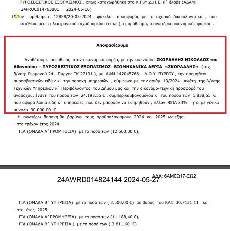🚩 Η απόφαση με ΑΔΑ : 6ΑΜ0Ω17-ΞΩ2 που ανέβηκε στην Διαύγεια στις 27.5.2024 με Αριθμό Πρωτοκόλλου 13706 , αφορά – όπως αναφέρεται στο σχετικό έγγραφο : « Την προμήθεια πυροσβεστικών ειδών κ΄ την παροχή υπηρεσιών , σύμφωνα με την αριθμ. 13/2024 μελέτη της Δ/νσης Τεχνικών Υπηρεσιών κ΄ Περιβάλλοντος του Δήμου μας και την οικονόμο-τεχνική προσφορά του αναδόχου, έναντι του ποσού των 24.193,55 € , συμπεριλαμβανομένου κ΄ του ποσού των 1.838,55 € που αφορά λοιπά είδη κ΄ υπηρεσίες που δεν μπορούν να εκτιμηθούν , πλέον ΦΠΑ 24% ήτοι με γενικό σύνολο 30.000,00 €»