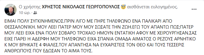 Ο λόγος είναι ότι ο συγκεκριμένος ιερέας, που τόσο πολύ κόσμο έχει βοηθήσει και συνεχίζει με μεγαλείο ψυχής να το κάνει, είχε εξασφαλίσει τέσσερεις φιάλες αίμα με την σπάνια ομάδα 0 ρέζους αρνητικό για τον νεαρό μετά από σοβαρό τροχαίο που είχε.