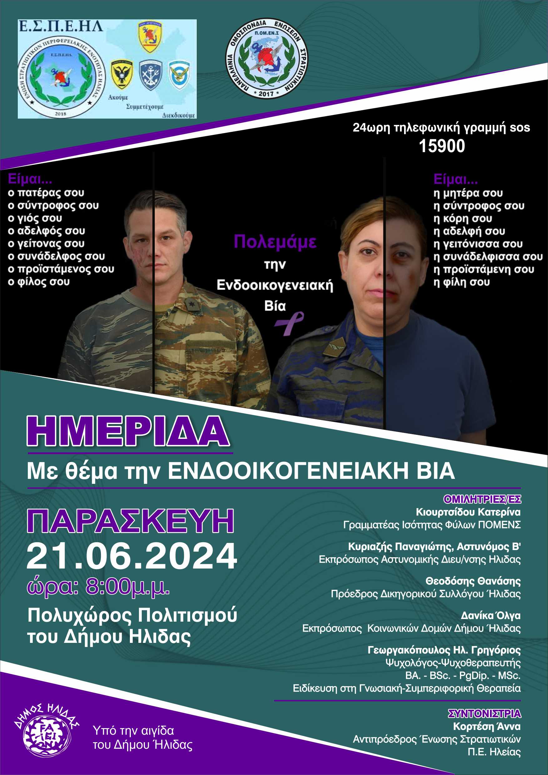Η ένωση Στρατιωτικών Νομού Ηλείας σε συνεργασία με την Πανελλήνια Ομοσπονδία Ενώσεων Στρατιωτικών, διοργανώνουν ημερίδα με θέμα την ενδοοικογενειακή βία, την Παρασκευή 21 Ιουνίου και ώρα 8.00′ μ.μ. στον Πολυχώρρο Πολιτισμού του Δήμου Ηλιδας.