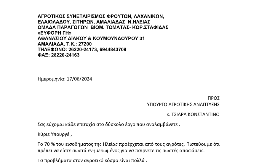 Επιστολή στο νέο υπουργό Αγροτικής Ανάπτυξης Κώστα Τσιάρα, έστειλε η Ομάδα Παραγωγών Αμαλιάδας, σε μια ακόμη προσπάθεια να λυθούν μερικά από τα χρονίζοντα αγροτικά προβλήματα.