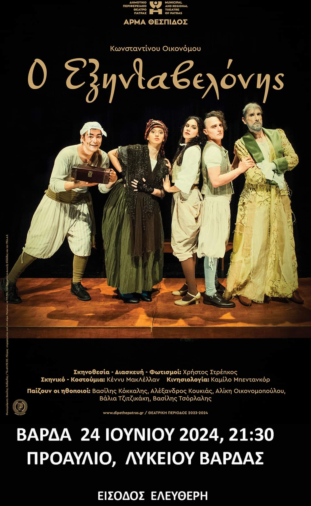 Την Δευτέρα 24/06/2024 και ώρα 21:30 στον αύλειο χώρο του Λυκείου Βάρδας το Άρμα Θέσπιδος του Δημοτικού Περιφερειακού Θεάτρου Πάτρας παρουσιάζει τον Εξηνταβελόνη του Κωνσταντίνου Οικονόμου , ένα από τα σημαντικότερα έργα του νεοελληνικού διαφωτισμού. Το έργο γράφτηκε το 1816 και αποτελεί ελληνική μεταφορά του “Φιλάργυρου” του Μολιέρου που εστιάζει σε κοινωνικά θέματα της εποχής του. Η ιδιωματική του γλώσσα, οι κωμικές καταστάσεις, καθώς και οι αντιπροσωπευτικοί χαρακτήρες της εποχής που εκτυλίσσεται το έργο, του προσδίδουν μια ιδιαίτερη θέση στο νεοελληνικό δραματολόγιο.