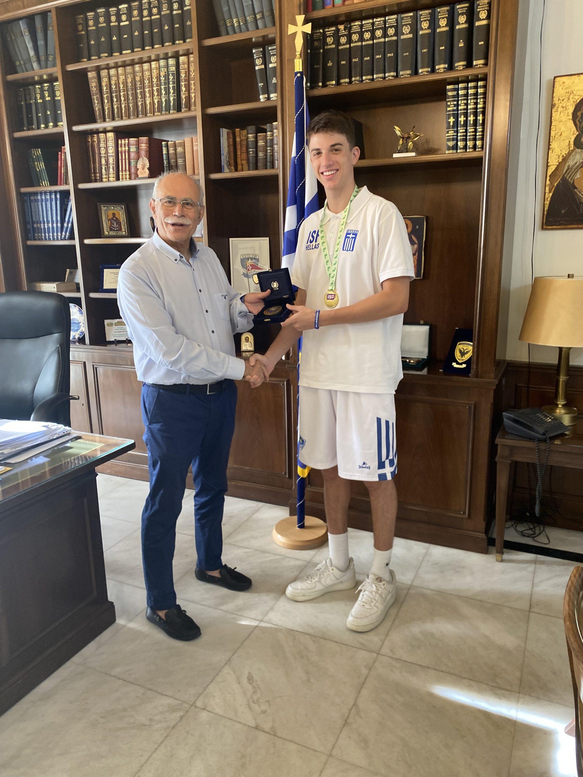 Τον Ηλείο παγκόσμιο πρωταθλητή με την ομάδα μπάσκετ του Ελληνικού Κολεγίου Θεσσαλονίκης, Βαγγέλη Γιαννάτο, τίμησε ο Δήμαρχος Πύργου κ. Στάθης Καννής κατά τη διάρκεια της συνάντησης που είχαν στο γραφείο του, στο Λάτσειο Δημοτικό Μέγαρο. Ο Δήμαρχος Πύργου αφού τον συνεχάρη για την πρόσφατη επιτυχία που είχε στο παγκόσμιο σχολικό πρωτάθλημα μπάσκετ καθώς επίσης και για την εισαγωγή του στα ΤΕΦΑΑ, του ευχήθηκε να έχει υγεία και ακόμα περισσότερες διακρίσεις στο μέλλον.