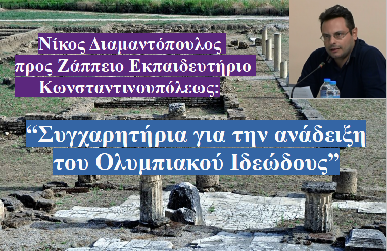 Από εδώ που βρίσκεται η Οικουμενική και ξακουστή Ολυμπία. Σας γράφω από τα ιερά χώματα της Ήλιδας, της διοργανώτριας Πόλης των Ολυμπιακών Αγώνων της αρχαιότητας. Επικοινωνώ σήμερα μαζί σας, πληροφορηθείς από Μέσα Μαζικής Ενημέρωσης (βλ. Open Tv), για μια εκδήλωση του Ζαππείου Σχολείου Κωνσταντινουπόλεως, εν σχέσει με το νόημα του Ολυμπισμού. Μια εκδήλωση που έγινε προσφάτως και ήταν αφιερωμένη στους Ολυμπιακούς Αγώνες, καθώς και στους οραματιστές της αναβίωσης τους, αείμνηστους ευεργέτες Ευαγγέλη και Κωνσταντίνο Ζάππα, οι οποίοι υπήρξαν και ιδρυτές της Σχολής σας.