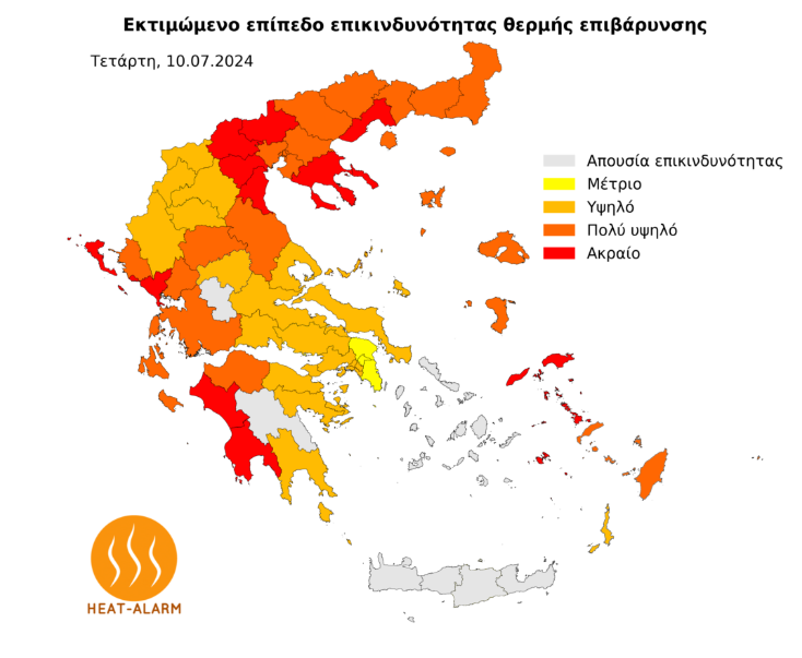 Σύμφωνα με τις τελευταίες διαθέσιμες εκτιμήσεις του συστήματος HEAT-ALARM, αυξημένη επικινδυνότητα λόγω θερμής επιβάρυνσης αναμένεται την Τετάρτη 10 Ιουλίου 2024 σε βόρεια, κεντρικά και δυτικά τμήματα της ηπειρωτικής και νησιωτικής Ελλάδας, όπως και σε νησιά του Ανατολικού Αιγαίου. Όπως φαίνεται στον χάρτη, οι περιφερειακές ενότητες που αναμένεται να επηρεαστούν περισσότερο, φτάνοντας έως και το ακραίο επίπεδο επικινδυνότητας, περιλαμβάνουν την Καβάλα, την Χαλκιδική, το Κιλκίς, την Πέλλα, την Ημαθία, την Πιερία, την Θεσπρωτία, την Κέρκυρα, την Ηλεία, την Μεσσηνία, την Σάμο, την Ικαρία και την Κάλυμνο.
