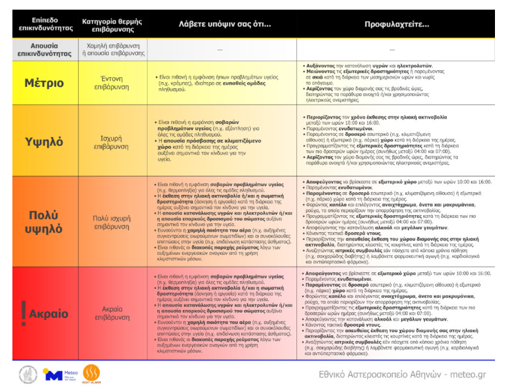 Πολύ υψηλές θερμοκρασίες, όπως αυτές που επηρεάζουν την Ελλάδα από τις αρχές της εβδομάδας, αποτελούν σημαντική απειλή για την ανθρώπινη υγεία λόγω της θερμής επιβάρυνσης που προκαλείται στον ανθρώπινο οργανισμό, σύμφωνα με το meteo. Ο βαθμός και η επικινδυνότητα αυτής της επιβάρυνσης εξαρτάται, πέρα από την θερμοκρασία, από την υγρασία, τον άνεμο, και την ακτινοβολία περιβάλλοντος, αλλά και από προσωπικές παραμέτρους (φύλο, ηλικία, βάρος, ύψος, επίπεδο ένδυσης και σωματικής δραστηριότητας). Λαμβάνοντας υπόψη όλους τους σχετικούς παράγοντες, το βιομετεωρολογικό σύστημα προειδοποίησης HEAT-ALARM εκδίδει προειδοποιήσεις σε κάθε περιφερειακή ενότητα της χώρας για ημέρες κατά τις οποίες η θερμή επιβάρυνση μπορεί να οδηγήσει σε σοβαρά προβλήματα υγείας.