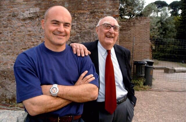 Πηγή εικόνας: https://www.newsbreak.gr // Ο Αντρέα Καμιλλέρι μαζί με τον πρωταγωνιστή της σειράς «Ο επιθεωρητής Μονταλμπάνο», Λούκα Τζινγκαρέτι.