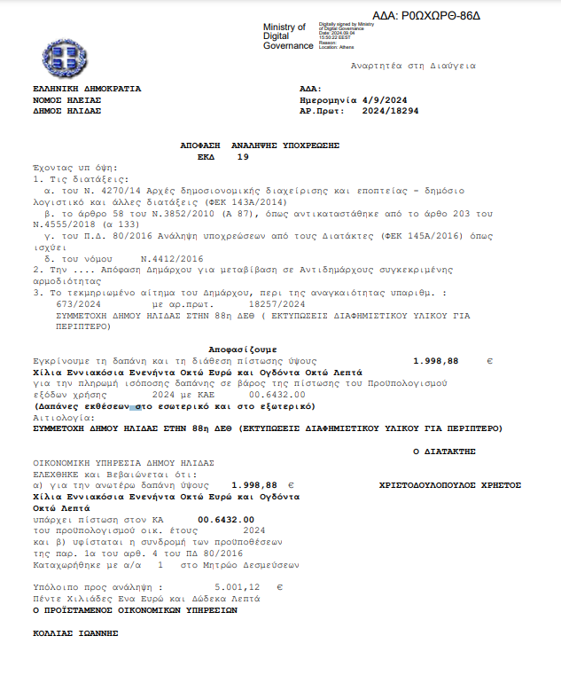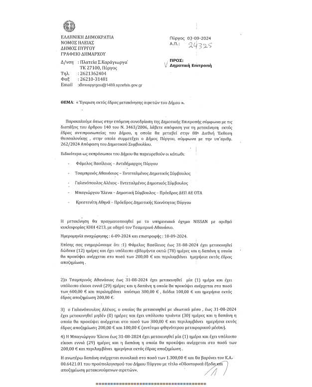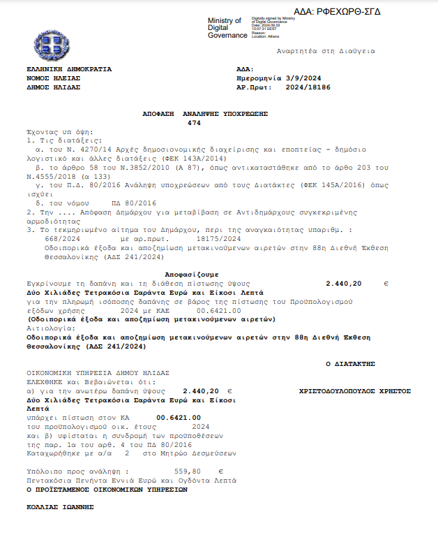 2.440, 20 ευρώ είναι τα… οδοιπορικά έξοδα και αποζημίωση μετακινούμενων αιρετών του Δήμου Ηλιδας στην 88η Διεθνή Έκθεση Θεσσαλονίκης, χωρίς βέβαια να λένε πόσοι θα πάνε και ποιος θα είναι ο ρόλος του καθενός εκεί, σύμφωνα με απόφαση που δημοσιεύτηκε στη Διαύγεια, στις 3 Σεπτεμβρίου. Επίσης, ακόμα 1.998,88 ευρώ δαπανούνται για εκτυπώσεις διαφημιστικού υλικού για περίπτερο, αλλά χωρίς περίπτερο στην Εκθεση Θεσσαλονίκης του δήμου Ηλιδας. Προφανώς θα ενσωματωθούν στο… περίπτερο της Περιφέρειας Δυτικής Ελλάδας.