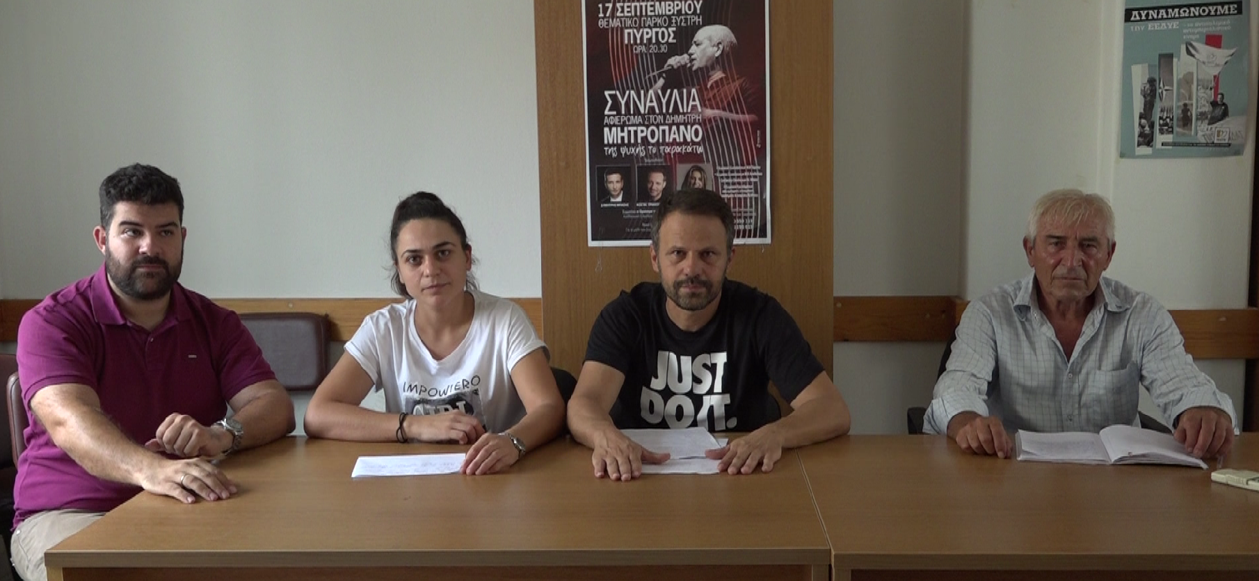 Τέλος, η αντιπρόεδρος του σωματείου Ιδιωτικών Υπαλλήλων Ελένη Τσίγκλα σημείωσε πως «Σε συνέχεια της προηγούμενης δράσης των σωματείων στην περιοχή μας, πήραμε την πρωτοβουλία να προχωρήσουμε σε συναυλία αφιέρωμα στον Δημήτρη Μητροπάνο. Σε αυτή την πρωτοβουλία των σωματείων που συμμετέχει και το σωματείο ιδιωτικών υπαλλήλων, η είσοδος για όλα τα μέλη της σωματείων είναι δωρεάν και για τον υπόλοιπο λαό δέκα ευρώ. Καλούμε το λαό της περιοχής να αγκαλιάσει αυτή την εκδήλωση – αφιέρωμα στον Δημήτρη Μητροπάνο».