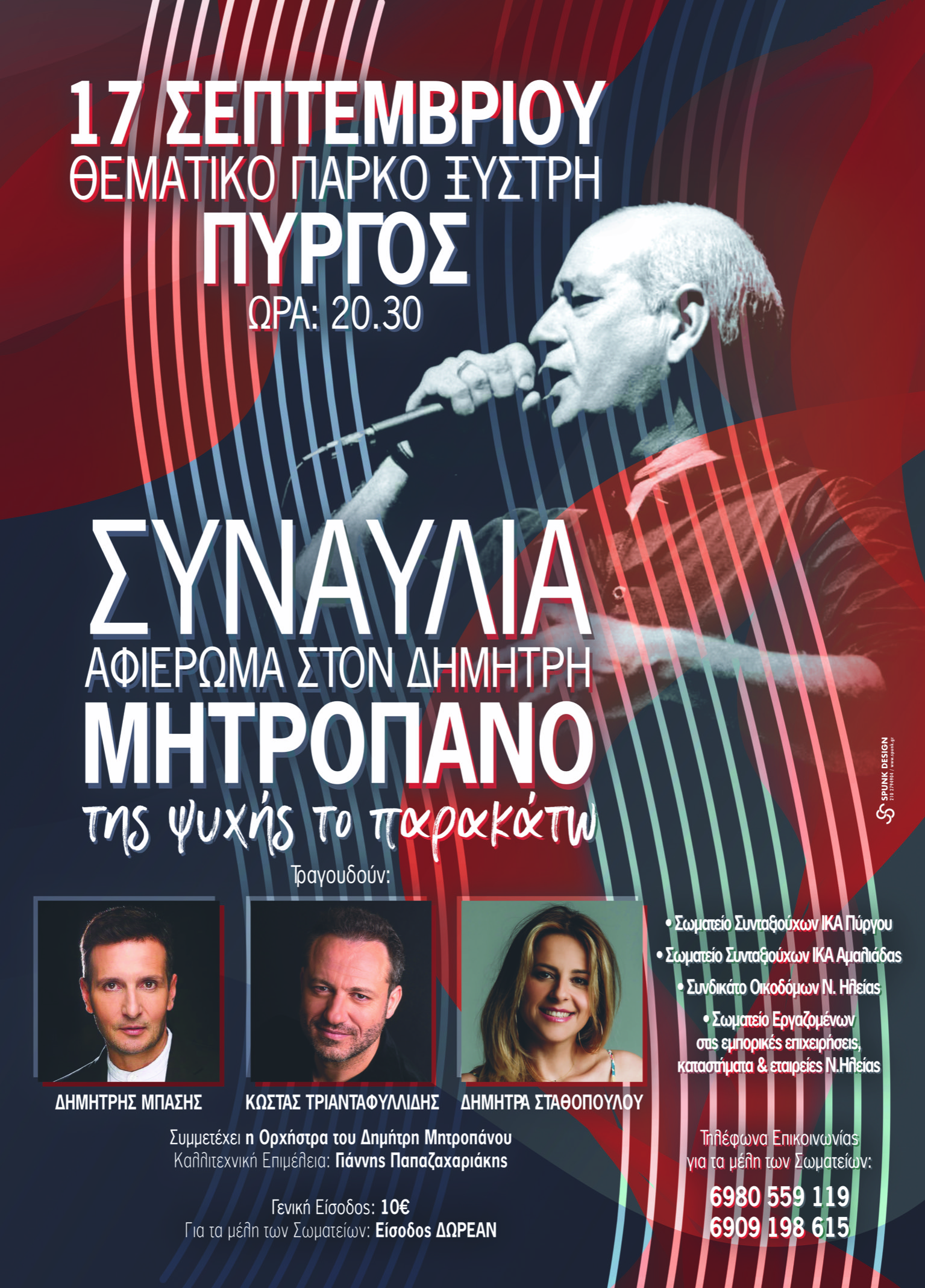 Ένα αφιέρωμα στον μεγάλο λαϊκό τραγουδιστή Δημήτρη Μητροπάνο με αφορμή την συμπλήρωση 12 ετών από τον θάνατό του, διοργανώνουν τα Σωματεία Οικοδόμων, Ιδιωτικών Υπαλλήλων και Συνταξιούχων ΙΚΑ Πύργου και Αμαλιάδας την Τρίτη 17 Σεπτεμβρίου στις 9 το βράδυ στο Πάρκο Ξυστρή στον Πύργο. Δημήτρης Μπάσης, Κώστας Τριανταφυλλίδης και Δήμητρα Σταθοπούλου θα ερμηνεύσουν τις μεγάλες επιτυχίες του αξεπέραστου ερμηνευτή, σε μια μαγική βραδιά όπου η είσοδος για τα μέλη των σωματείων θα είναι ελεύθερη και για τους υπόλοιπους πολίτες δέκα ευρώ. Τα σωματεία που διοργανώνουν την συναυλία παραχώρησαν συνέντευξη τύπου όπου έκαναν γνωστές τις λεπτομέρειες της εκδήλωσης και κάλεσαν τους πολίτες να παραβρεθούν για να τιμήσουν τον Δημήτρη Μητροπάνο και να περάσουν μια αξέχαστη βραδιά»