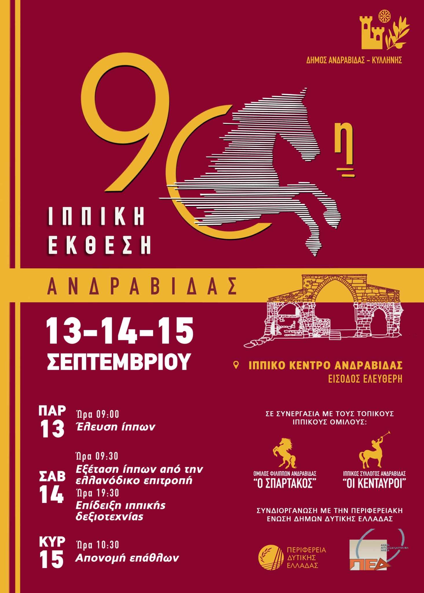 Η 90η Ιππική Έκθεση Ανδραβίδας έρχεται στις 13, 14 και 15 Σεπτεμβρίου 2024, στο αναβαθμισμένο Ιππικό Κέντρο Ανδραβίδας. Δεκάδες άλογα και αναβάτες είναι έτοιμοι να εντυπωσιάσουν το κοινό σε μια Ιππική Έκθεση αντάξια της μακρόχρονης ιστορίας της. Υπό την αιγίδα του Δήμου Ανδραβίδας-Κυλλήνης, με συνδιοργάνωση της Περιφέρειας Δυτικής Ελλάδας και της ΠΕΔ, και με την συνεργασία από τον Όμιλο Φιλίππων Ανδραβίδας «Σπάρτακος» και τον Ιππικό Σύλλογο Ανδραβίδας «Κένταυροι», η Ιππική Έκθεση συμπληρώνει φέτος τα 90 χρόνια ζωής και σας προσκαλεί να την τιμήσετε με την παρουσία σας!