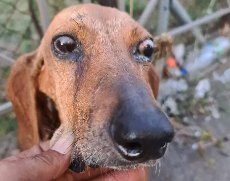 Το σκυλί βρέθηκε σε πολύ κακή κατάσταση, τυφλό και με σοβαρά δερματικά προβλήματα που ενδεχομένως συνδέονται με λεϊσμανίαση (καλαζάρ). Το ζώο δεν είχε δεχθεί ποτέ την απαραίτητη κτηνιατρική φροντίδα, ούτε είχε αποπαρασιτωθεί ή στειρωθεί. Όταν αρρώστησε, ο ιδιοκτήτης του, αντί να το φροντίσει, προτίμησε να το πετάξει στο ποτάμι για να πεθάνει με αργό και βασανιστικό τρόπο.
