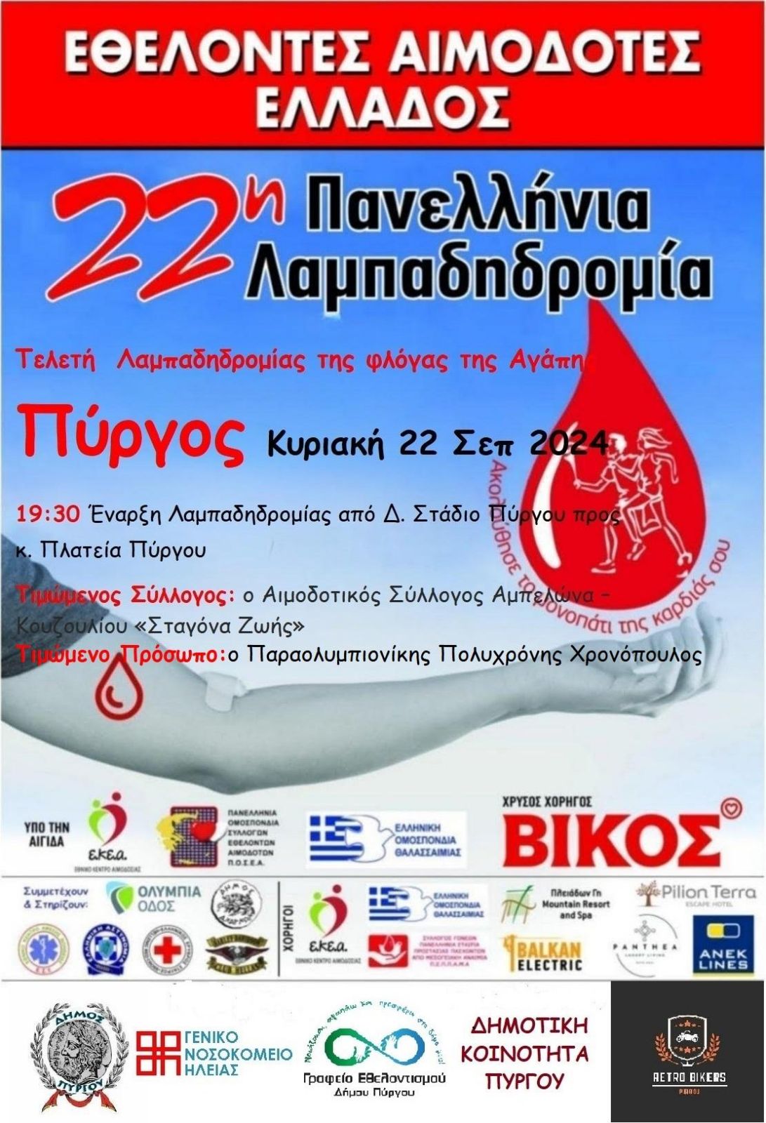 Ο Πύργος, την προσεχή Κυριακή 22 Σεπτεμβρίου 2024, θα είναι ο επόμενος σταθμός της «Φλόγας της Αγάπης» που ταξιδεύει σε όλη την Ελλάδα στο πλαίσιο της διεξαγωγής της 22 ης Πανελλήνιας Λαμπαδηδρομίας, η οποία διοργανώνεται από την Πανελλήνια Ομοσπονδία Συλλόγων Εθελοντών Αιμοδοτών (ΠΟΣΕΑ), με τη συνεργασία αιμοδοτικών συλλόγων, δήμων αλλά και δομών υγείας σε όλη την χώρα. Η Φλόγα της Αγάπης, που την περασμένη Κυριακή έφτασε στην κοινότητα Αμπελώνα – με τον Αιμοδοτικό Σύλλογο Αμπελώνα – Κουζουλίου «Σταγόνα Ζωής» να συμμετέχει για 7 η χρονιά στην σημαντική αυτή κοινωνική δράση – θα παραδοθεί στον Δήμο Πύργου, για πρώτη φορά, με στόχο να ενδυναμωθεί ακόμα περισσότερα και να μεταφερθεί το σημαντικό μήνυμα της αξίας προσφοράς αίματος, ενός αγαθού που δεν παράγεται παρά μόνο προσφέρεται από άνθρωπο στον συνάνθρωπο, ως το πιο σημαντικό δώρο ζωής.
