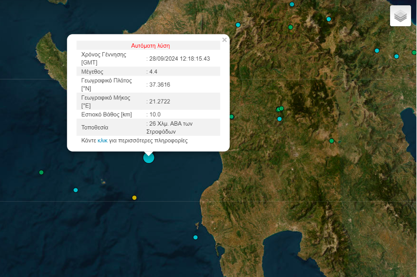 Το επίκεντρό της σεισμικής δόνησης βρίσκεται 26 χιλιόμετρα ανατολικά, βορειοανατολικά των Στροφάδων, ενώ το εστιακό βάθος του σεισμού, που συνέβηανοιχτά του Πύργου είναι στα 10 χιλιόμετρα.
